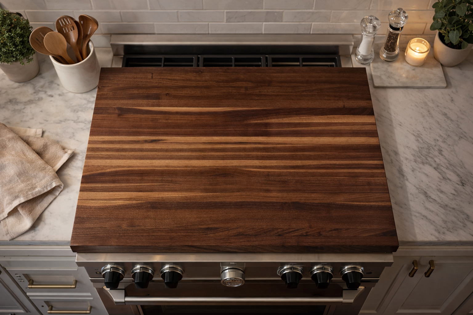 Transform your kitchen with The Canopy our handcrafted solid walnut stove top cover designed to elevate both style and functionality. Built from premium American walnut this minimalist board adds warmth texture and elegance to your space while giving you valuable extra counter area.